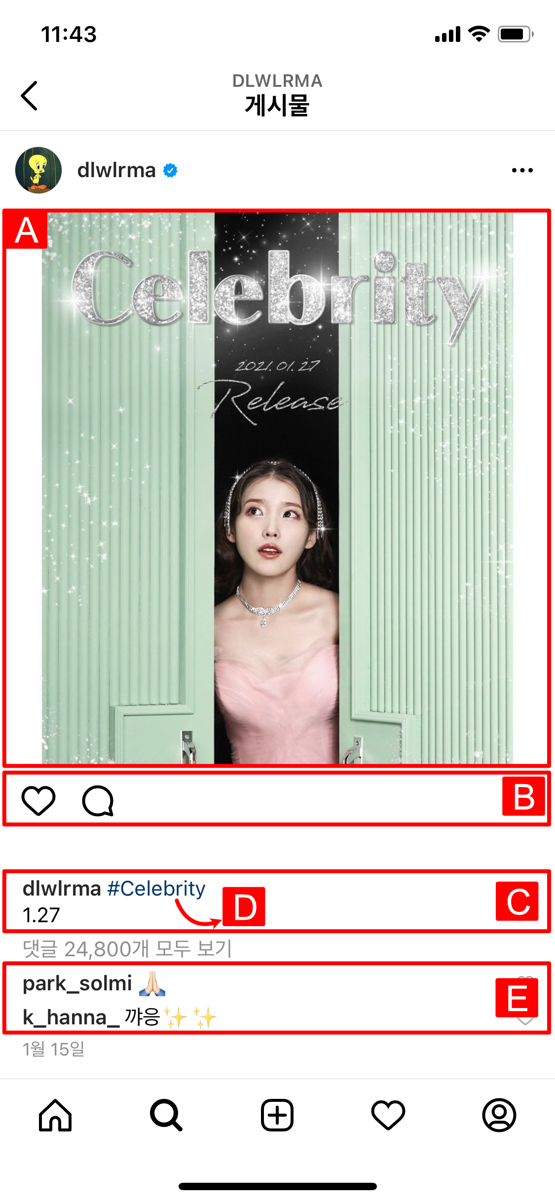게시물에 #감성 #맛집 등의 해시태그(D)를 남길 수 있으며, 이 해시태그를 누르면 이 해시태그가 사용된 모든 게시물을 한 데 모아 볼 수 있습니다.