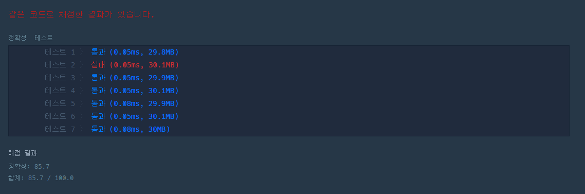처음엔 이런식의 코드를 작성을 했으나, 정확성 테스트에서 한개의 문제가 실패했다는 결과를 확인 할 수 있었다.